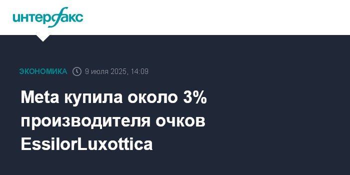 Москва. 9 июля. INTERFAX.RU - Американская компания Meta (признана в РФ экстремистской организацией и запрещена) купила около 3% франко-итальянского производителя очков EssilorLuxottica, сообщает агентство Bloomberg со ссылкой на источники.