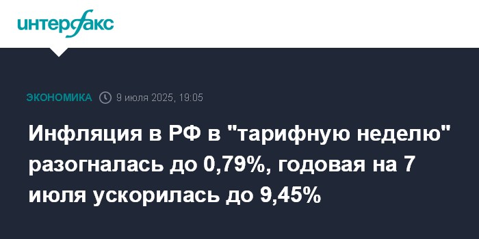 Инфляция в РФ в "тарифную неделю" разогналась до 0,79%, годовая на 7 июля ускорилась до 9,45%