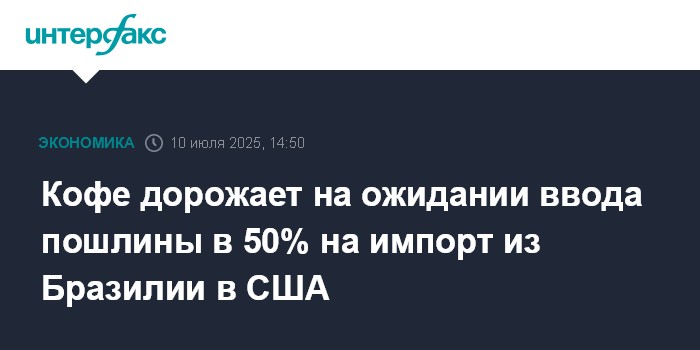 Москва. 10 июля. INTERFAX.RU - Цена кофе сорта арабика активно растет на новости, что США с 1 августа введут тариф в 50% на весь импорт из Бразилии.