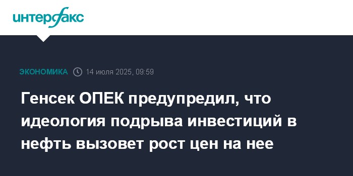 Москва. 14 июля. INTERFAX.RU - Идеология необходимости прекращения инвестиций в добычу нефти вызовет рост цен не только на нее, но и на другие виды энергии, и это уже наблюдается в Европе, заявил журналистам генеральный секретарь ОПЕК Хайтам Аль-Гайс.