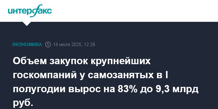 Москва. 14 июля. INTERFAX.RU - Объем закупок крупнейших госкомпаний у самозанятых в I половине 2025 года составил 9,3 млрд рублей, что на 83% больше аналогичного показателя за 2024 год. Об этом говорится в сообщении "Корпорации МСП" (занимается, в частности, мониторингом закупок госкомпаний у субъектов малого и среднего предпринимательства).