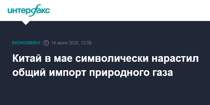 Москва. 14 июля. INTERFAX.RU - Китай в мае 2025 года импортировал суммарно (по трубопроводам и СПГ) 13,713 млрд куб. м природного газа, что на 1% больше, чем годом ранее (13,558 млрд куб. м), сообщает Главное таможенное управления КНР. До этого импорт газа снижался семь месяцев подряд.