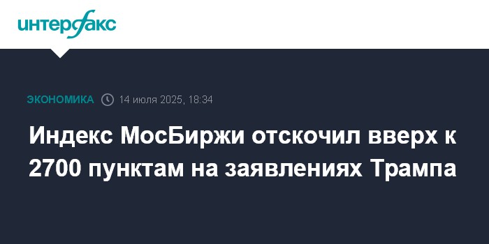 Москва. 14 июля. INTERFAX.RU - Вечером в понедельник российский рынок акций совершил рывок вверх после заявления президента США Дональда Трампа о намерении ввести вторичные пошлины в 100% в отношении России, если за 50 дней не получится добиться украинского урегулирования.