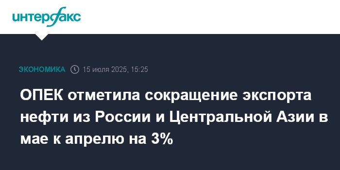 Москва. 15 июля. INTERFAX.RU - В мае общий объем экспорта нефти из России и стран Центральной Азии в мае составил в среднем 6,4 млн баррелей в сутки (б/с), что на 172 тысячи б/с, или 2,6% меньше, чем в апреле, сообщается в ежемесячном отчете ОПЕК.