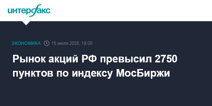 Москва. 15 июля. INTERFAX.RU - Рынок акций РФ во вторник продолжил восстановление начала недели, толчок чему придали заявления президента США Дональда Трампа о возможности ввода "суровых мер" против Москвы лишь при отсутствии сделки по урегулированию ситуации на Украине через 50 дней; фактором риска остается вероятность утверждения новых антироссийских санкций ЕС. Индекс МосБиржи превысил 2750 пунктов и достиг уровня недельной давности, лидерами роста выступили акции ВТБ (+5,1%), "МТС" (+4,2%) и "ВК" (+4,2%); во "втором эшелоне" наблюдалось ралли ряда бумаг энергокомпаний Юга, где потребление мощности достигло рекорда.