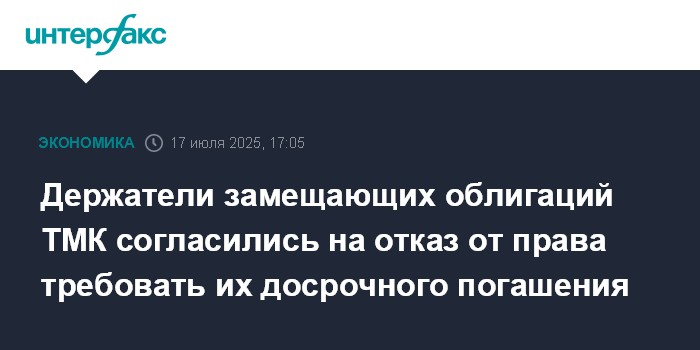 Москва. 17 июля. INTERFAX.RU - Держатели долларовых замещающих облигаций "Трубной металлургической компании" с погашением в 2027 году согласились на отказ от права требовать досрочного погашения этих бумаг, возникающего из-за планируемой реорганизации ТМК.