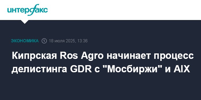 Москва. 18 июля. INTERFAX.RU - Кипрская компания Ros Agro Plc (бывшая холдинговая структура группы "Русагро") объявила о начале процесса делистинга своих GDR с Московской и Астанинской бирж. Другие подробности, включая ориентировочную дату делистинга, в сообщении не приводятся.