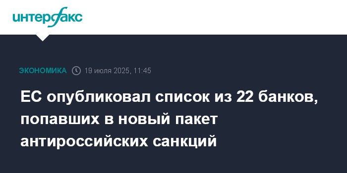 Москва. 19 июля. INTERFAX.RU - ЕС опубликовал в "Официальном журнале" список из 22 банков, подпавших под ограничения в рамках 18-го пакета антироссийских санкций.
