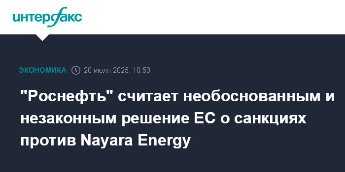 "Подобные действия Евросоюза демонстрируют полное пренебрежение не только к международному праву, но и к суверенитету третьих стран. "Роснефть" рассматривает эти санкции как часть деструктивной политики ЕС, направленной на дестабилизацию глобальных энергорынков. Ограничения в отношении Nayara Energy являются очередным примером применения Евросоюзом практики недобросовестной конкуренции. Рассчитываем, что Nayara Energy предпримет меры по защите законных интересов своих акционеров и потребителей, которые будут поддержаны правительствами России и Индии", - говорится в заявлении.