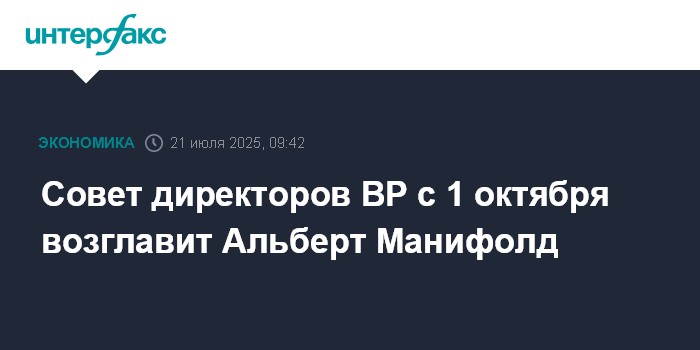 Москва. 21 июля. INTERFAX.RU - Новым председателем совета директоров BP Plc станет Альберт Манифолд, говорится в сообщении компании.