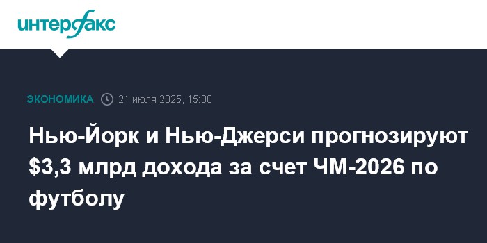 Москва. 21 июля. INTERFAX.RU - Город Нью-Йорк и штат Нью-Джерси ожидают, что проведение матчей чемпионата мира по футболу 2026 года принесет им $3,3 млрд, говорится в отчете регионального комитета по организации соревнования.
