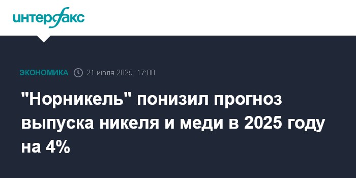 Москва. 21 июля. INTERFAX.RU - "Норникель" понизил прогноз производства никеля и меди на 2025 год, оставив прогноз производства платиноидов без существенных изменений, сообщила компания в понедельник.