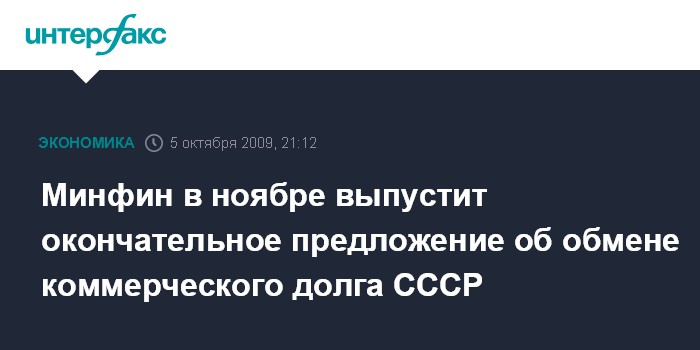 Москва. 5 октября. INTERFAX.RU - Минфин РФ намерен выпустить в первой половине ноября окончательное предложение об обмене допущенных к урегулированию требований по коммерческому долгу бывшего СССР, говорится в сообщении министерства.