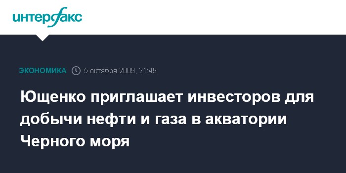 Киев. 5 октября. INTERFAX.RU - Президент Украины Виктор Ющенко заявляет, что Украина заинтересована в иностранных инвестициях, которые можно будет использовать при добыче нефти и газа в акватории Черного моря.