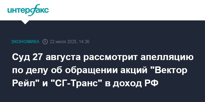 Суд 27 августа рассмотрит апелляцию по делу об обращении акций "Вектор Рейл" и "СГ-Транс" в доход РФ