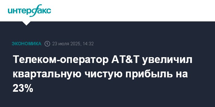 Москва. 23 июля. INTERFAX.RU - Американский телекоммуникационный оператор AT&T Inc. во втором квартале 2025 года увеличил чистую прибыль на 23%, при этом скорректированная прибыль и выручка оказались лучше ожиданий.