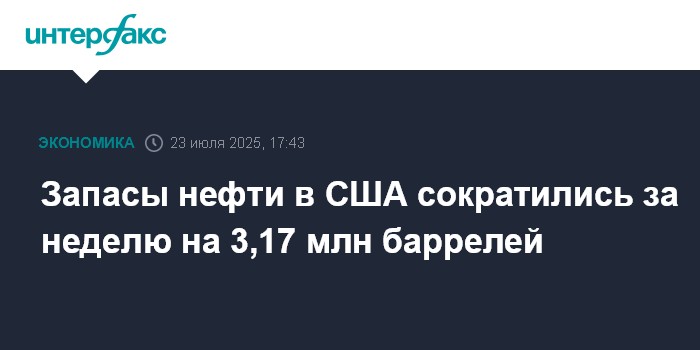 Москва. 23 июля. INTERFAX.RU - Коммерческие запасы нефти в США на прошлой неделе уменьшились на 3,17 млн баррелей - до 419 млн баррелей, говорится в еженедельном докладе министерства энергетики.