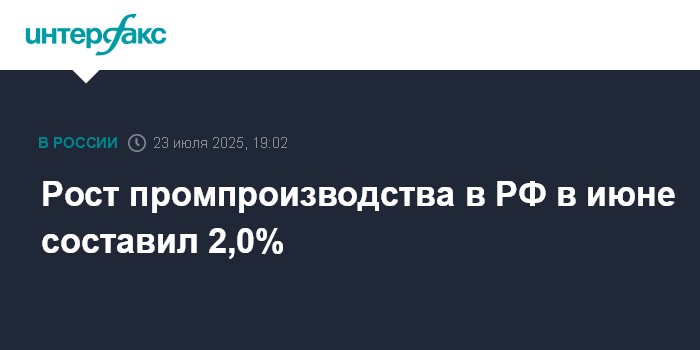 Москва. 23 июля. INTERFAX.RU - Рост промпроизводства в РФ в июне 2025 года составил 2,0% в годовом сравнении после повышения на 1,8% в мае, на 1,5% в апреле, 0,8% в марте, 0,2% в феврале и на 2,2% в январе, сообщил в среду Росстат.