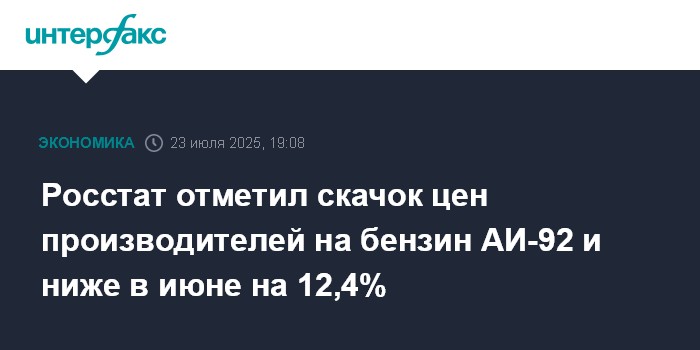 Москва. 23 июля. INTERFAX.RU - Рост цен производителей на бензин в РФ в июне относительно предыдущего месяца составил 7,5% после 10,5% в мае, 2,2% в апреле и снижения в предыдущие шесть месяцев.