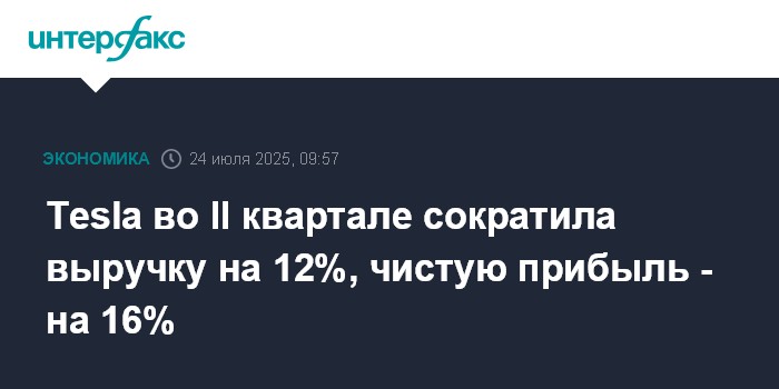 Москва. 24 июля. INTERFAX.RU - Американский производитель электромобилей Tesla сократил выручку и чистую прибыль во втором квартале, при этом скорректированная прибыль и выручка оказались хуже ожиданий рынка.
