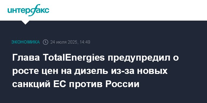 Москва. 24 июля. INTERFAX.RU - Новые санкции Евросоюза, запрещающие импорт нефтепродуктов, произведенных из российской нефти, толкают цены на дизельное топливо вверх, заявил на телеконференции глава TotalEnergies Патрик Пуяннэ.