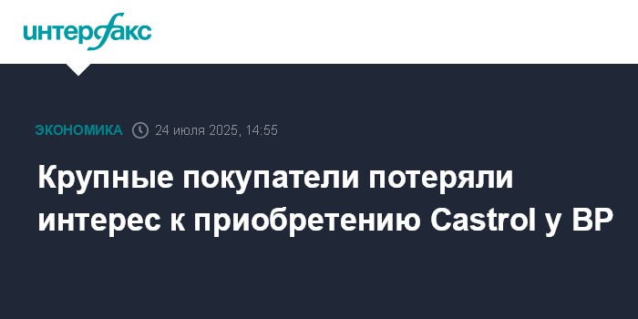 Москва. 24 июля. INTERFAX.RU - Несколько крупных потенциальных покупателей потеряли интерес к приобретению бизнеса британской BP Plc по производству смазочных материалов (Castrol), сообщает Bloomberg со ссылкой на информированные источники.