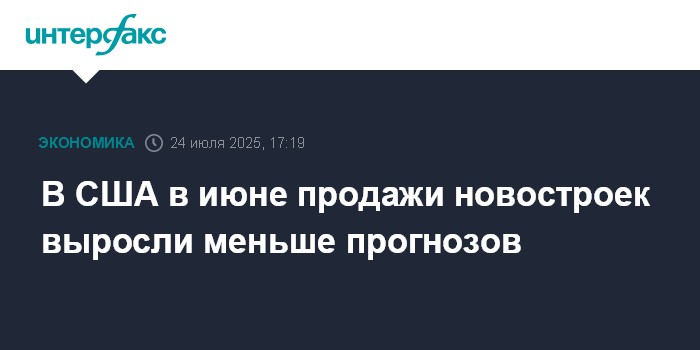 Москва. 24 июля. INTERFAX.RU - В США в июне продажи новых домов увеличились на 0,6% к маю и составили 627 тысяч в пересчете на годовые темпы, сообщило Министерство торговли страны.