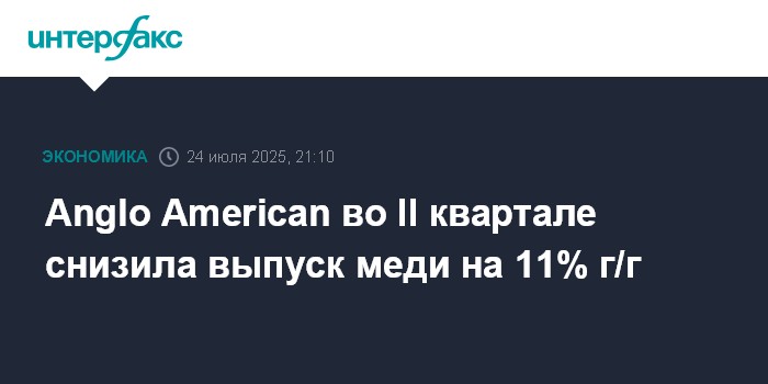 Москва. 24 июля. INTERFAX.RU - Anglo American во втором квартале 2025 года снизила выпуск меди на 11% к данным годичной давности, до 173 тысяч тонн, сообщила компания.