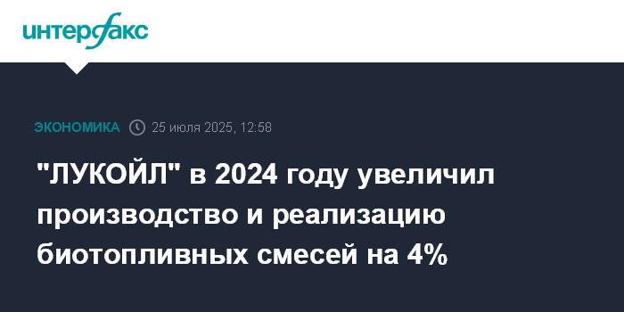 Москва. 25 июля. INTERFAX.RU - Производство биотопливных смесей на НПЗ "ЛУКОЙЛа" в 2024 году выросло на 3,8% и превысило 2 млн тонн, реализация увеличилась на 4%, до 7 млн тонн, сообщается в отчете компании об устойчивом развитии.