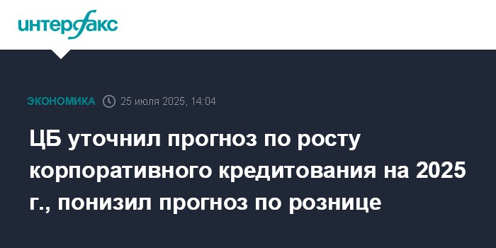 Москва. 25 июля. INTERFAX.RU - Совет директоров ЦБ РФ по итогам заседания в пятницу уточнил прогноз по росту корпоративного кредитования в России на 2025 год, теперь он ожидается на уровне 9-12%, говорится в среднесрочном прогнозе, опубликованном на сайте регулятора.