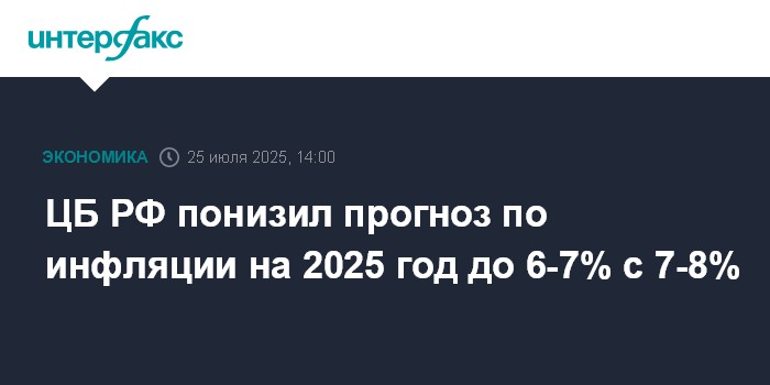 ЦБ РФ понизил прогноз по инфляции на 2025 год до 6-7% с 7-8%
