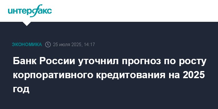 Москва. 25 июля. INTERFAX.RU - Совет директоров Банка России уточнил прогноз по росту корпоративного кредитования на 2025 год, теперь он ожидается на уровне 9-12%, говорится в среднесрочном прогнозе на сайте регулятора.