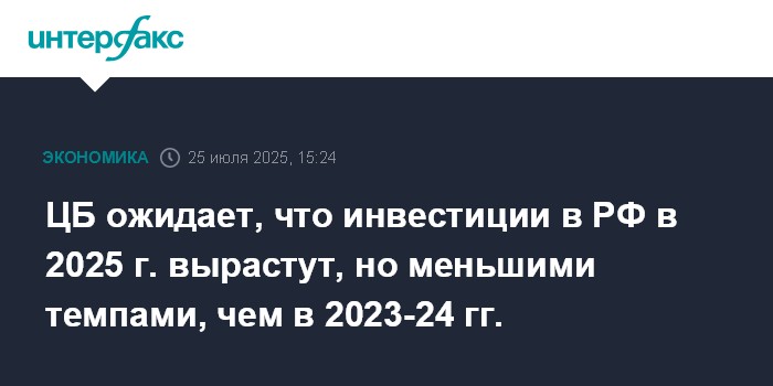ЦБ ожидает, что инвестиции в РФ в 2025 г. вырастут, но меньшими темпами, чем в 2023-24 гг.