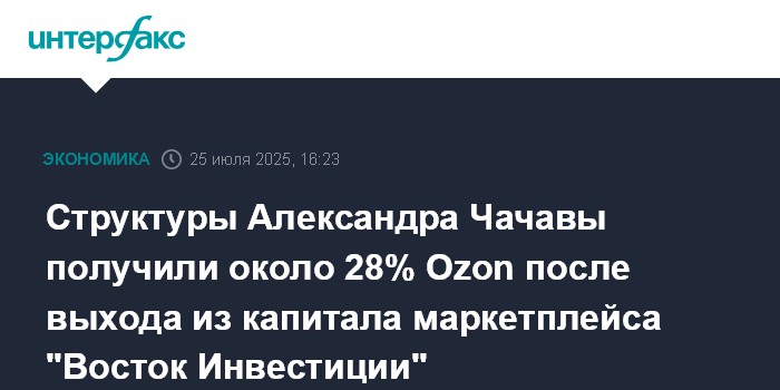 Москва. 25 июля. INTERFAX.RU - Новым совладельцем Ozon после выхода из капитала маркетплейса компании "Восток Инвестиции" стали структуры Александра Чачавы.