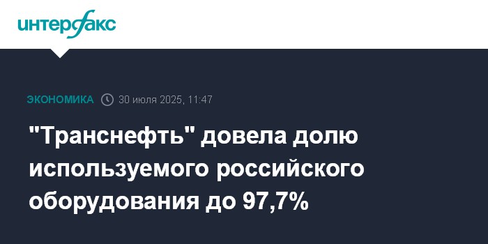 Москва. 30 июля. INTERFAX.RU - Доля отечественного оборудования, используемого в "Транснефти" составляет 97,7%, сообщил президент компании Николай Токарев на встрече с депутатами "Единой России", пишет корпоративный журнал "Трубопроводный транспорт нефти".