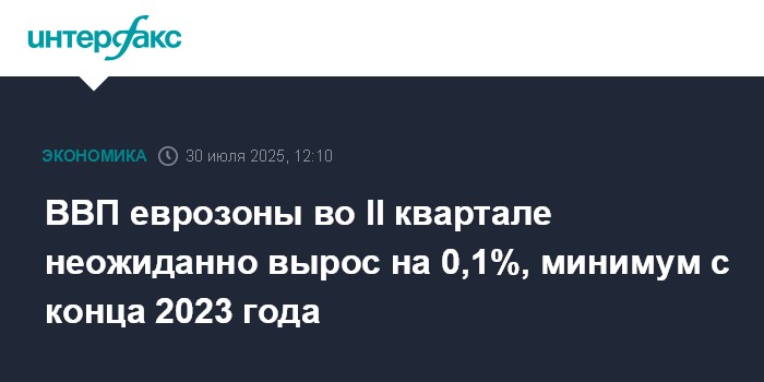 Москва. 30 июля. INTERFAX.RU - Экономика еврозоны во втором квартале 2025 года увеличилась на минимальные с конца 2023 года 0,1% по сравнению с предыдущими тремя месяцами, говорится в отчете статистического управления Европейского союза, представившего предварительные данные.