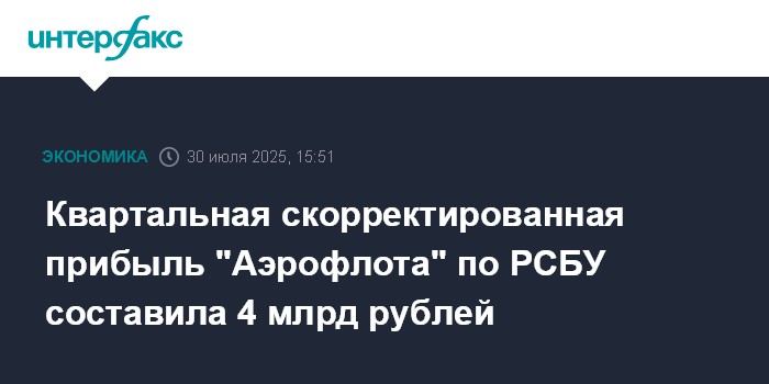 Москва. 30 июля. INTERFAX.RU - Авиакомпания "Аэрофлот" во II квартале 2025 года получила скорректированную прибыль по РСБУ в размере более 4 млрд рублей, сообщил перевозчик.