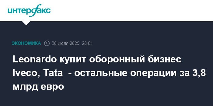 Москва. 30 июля. INTERFAX.RU - Iveco Group продаст свой оборонный бизнес итальянской Leonardo S.p.A за 1,7 млрд евро.