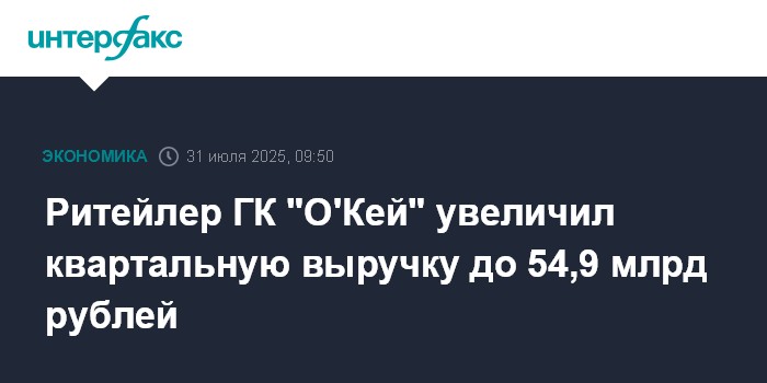 Москва. 31 июля. INTERFAX.RU - Ритейлер ГК "О'Кей" (O'Key Group) во II квартале 2025 года увеличил чистую розничную выручку на 4,9%, до 54,9 млрд рублей, сообщила компания.