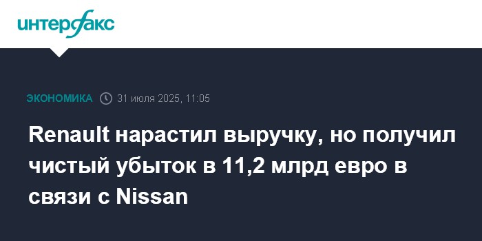 Москва. 31 июля. INTERFAX.RU - Французский автомобилестроительный концерн Renault SA увеличил выручку в первом полугодии на 2,5%, однако зафиксировал значительный чистый убыток из-за факторов, связанных с Nissan.