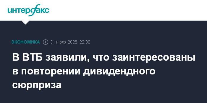"Менеджмент банка ВТБ заинтересован в том, чтобы выплата "дивидендного сюрприза" в 2025 году за 2024 год была не единичным фактором. Можно говорить о намерении, о желании, о том, что мы постараемся делать все возможное, от нас зависящее", - сообщил Пьянов в эфире РБК.