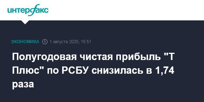 Москва. 1 августа. INTERFAX.RU - Чистая прибыль ПАО "Т Плюс" по РСБУ в I полугодии 2025 г. снизилась в 1,74 раза в годовом исчислении, до 7,57 млрд рублей, говорится в отчете компании.
