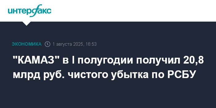 Москва. 1 августа. INTERFAX.RU - Чистый убыток ПАО "КАМАЗ" по РСБУ в I полугодии 2025 года составил 20,8 млрд руб. против прибыли 641,1 млн руб. в том же периоде прошлого года, говорится в отчетности группы.