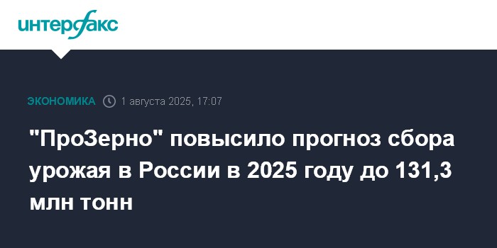Москва. 1 августа. INTERFAX.RU - Компания "ПроЗерно" повысила прогноз сбора зерновых и зернобобовых культур в России в 2025 году до 131,3 млн тонн (без новых регионов) со 130,3 млн тонн по июньской оценке.