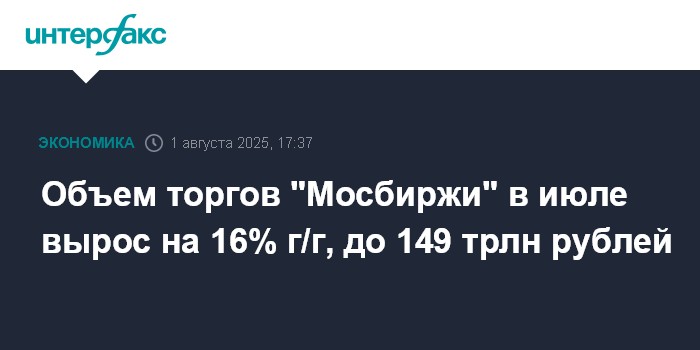 Москва. 1 августа. INTERFAX.RU - Совокупный объем торгов на рынках "Московской биржи" в июле 2025 года увеличился по сравнению с июлем 2024 года на 16,4%, до 149 трлн рублей со 128 трлн рублей, сообщила биржа.