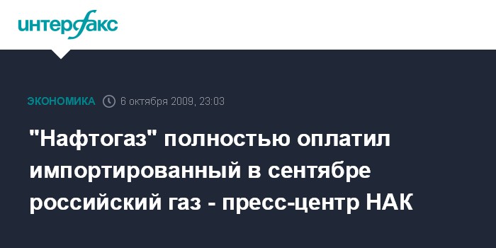 Киев. 6 октября. ИНТЕРФАКС-УКРАИНА - Национальная акционерная компания (НАК) "Нафтогаз Украины" своевременно и в полном объеме осуществила оплату закупленного в сентябре у российского ОАО "Газпром" природного газа, говорится в распространенном во вторник вечером пресс-релизе госхолдинга.