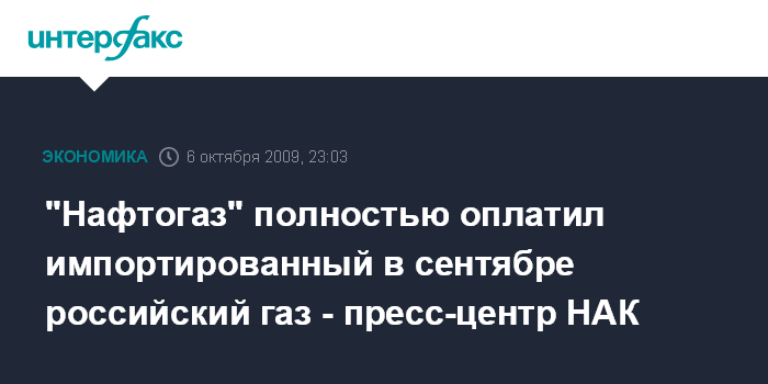 "Нафтогаз Украины" своевременно и в полном объеме рассчитался с ОАО "Газпром" за импортированный в сентябре 2009 года природный газ. Компания получила соответствующее подтверждение от банка-корреспондента, - говорится в сообщении НАК.