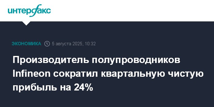 Москва. 5 августа. INTERFAX.RU - Германская Infineon Technologies AG, один из крупнейших в Европе производителей полупроводниковой продукции, сократила чистую прибыль в третьем финансовом квартале на 24%, что оказалось хуже прогнозов рынка.