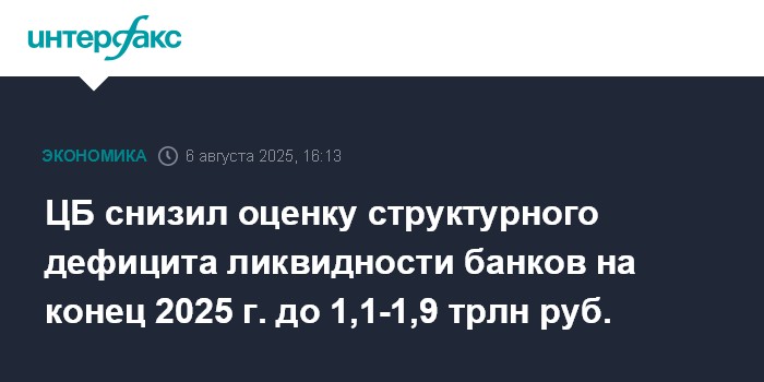ЦБ снизил оценку структурного дефицита ликвидности банков на конец 2025 г. до 1,1-1,9 трлн руб.