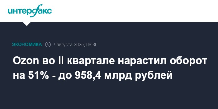 Москва. 7 августа. INTERFAX.RU - Ozon во II квартале 2025 года нарастил оборот (GMV, включая услуги) на 51% год к году - до 958,4 млрд рублей, сообщила компания.